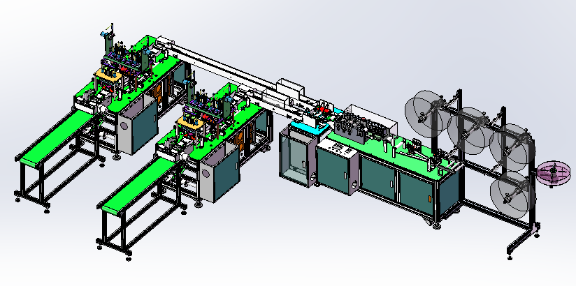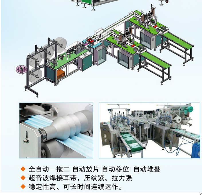 水線將口罩輸送至兩個口罩耳帶熔接工位,通過超聲焊接最終口罩成型;當口