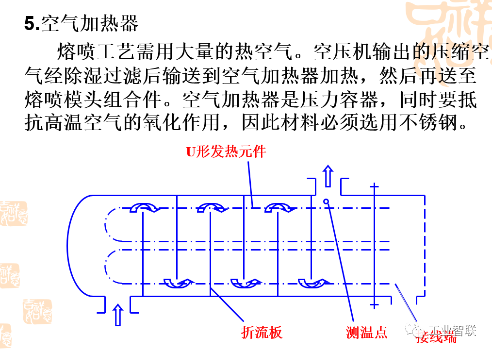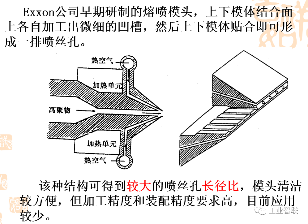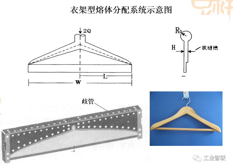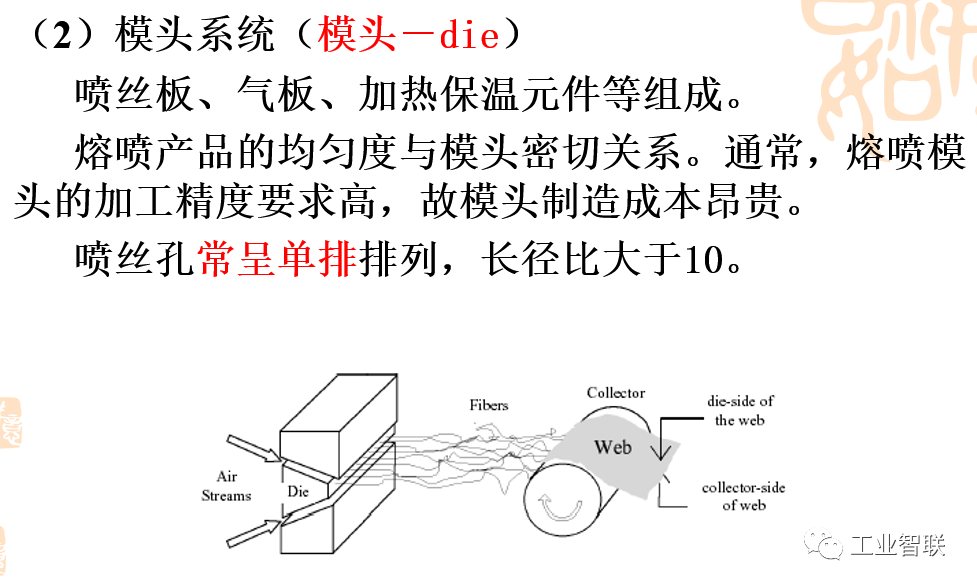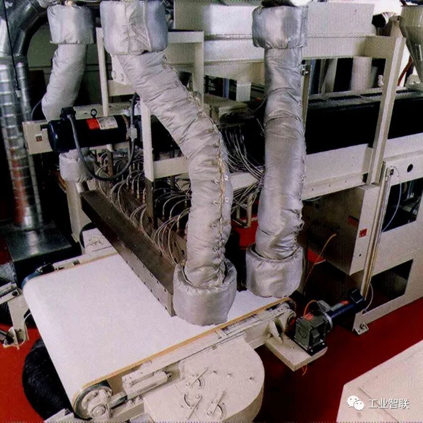 (一)熔噴的工藝流程 聚合物準備→熔融擠壓→計量泵→熔噴模頭組合件→熔體細流拉伸→冷卻→接收裝置 (二)熔噴設備 主要設備:上料機、螺桿擠出機、計量泵、熔噴模頭組合件、空壓機、空氣加熱器、接收裝置、卷繞裝置。 生產聚酯等原料,還需要切片干燥裝置。生產輔助設備主要有模頭清潔爐、靜電施加裝置和噴霧裝置等。 1.上料機 安裝于擠出機料斗之上。上料機的功能是將聚合物切片抽吸至螺桿擠出機料斗,通常具有自動功能,可按整個生產線的產量來設定單位時間的送料量。 1)聚合物熔體分配系統 保證聚合物熔體在整個熔噴模頭長度方向上均勻流動并具有均一的滯留時間,從而保證熔噴法非織造布在整個寬度上具有較均勻的性質。 目前熔噴工藝中主要采用衣架型聚合物熔體分配系統(T型分配系統不能均勻分配流體)。